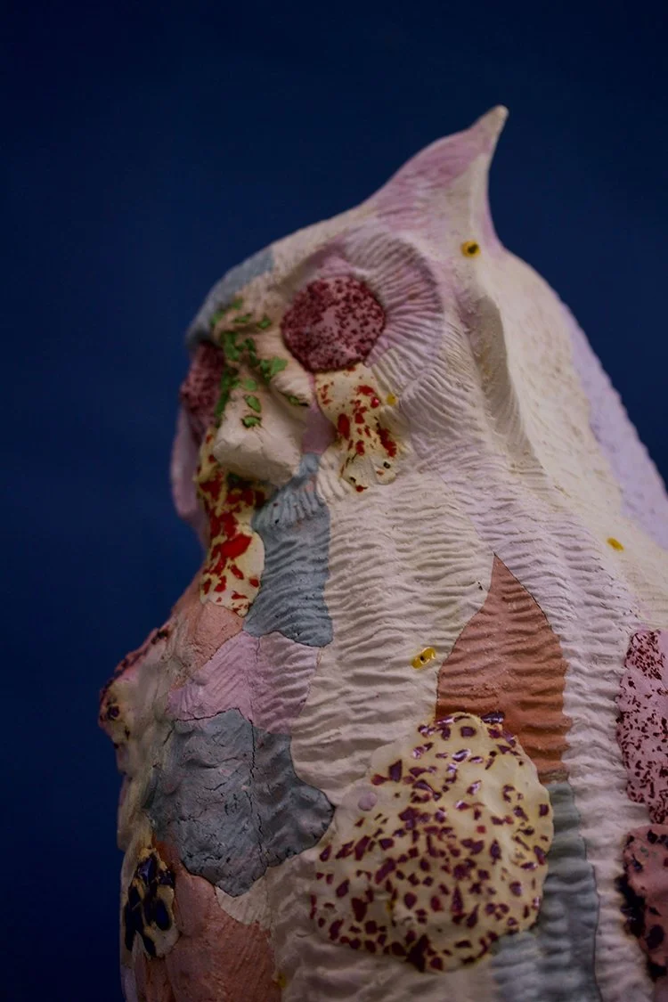 The patterning and shape of the glass forms give them an organic quality. Pulsating with life, they sit precariously on branches of richly textured ceramic tubes. Experimenting in melding media, the Crystal Chain Gang have made these cylindrical components by firing stoneware clay imbedded with tiny shards of glass and occasional slathers of glazed porcelain. They are fragile and roughly hewn, with uneven surfaces that appear as if afflicted with an unidentified condition. Also perched on the chandelier is a large ceramic barn owl, one of the most widely distributed species of owl on the planet. Like the majority of birds used by the Crystal Chain Gang, barn owls were introduced to Aotearoa New Zealand, bringing to mind historically imported diseases like measles and the Spanish flu.