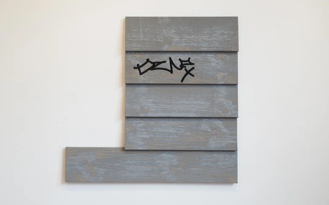 Over the last ten years, Hutchinson has developed an art practice based on his identification with graffiti subculture. Growing up in an air force family, he moved approximately twenty times up until the age of sixteen. He reacted to his transient childhood by vandalising other people’s property. What he described as “painting” became an act of self-determination: a way to stake a claim.[7] Through it, he discovered a community that spoke a universal language found on street corners.
